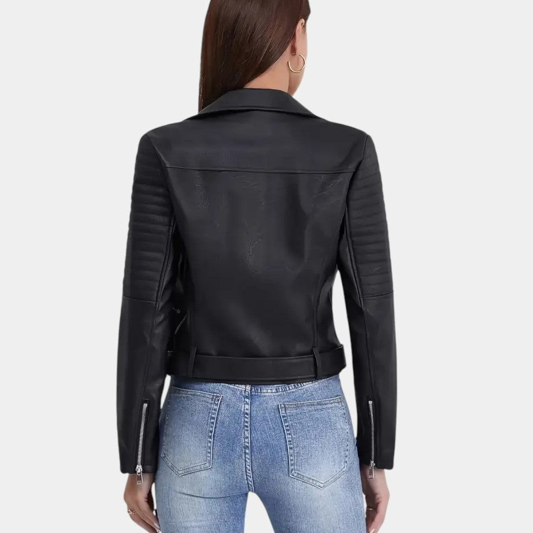 Denna förlängda jacka i ekolader är den perfekta detaljen för kvinnor som vill kombinera elegans med en djärv stil. Designen inspirerad av motorcykelutseendet ger outfiten självförtroende, medan den längre passformen tillför sofistikering och mångsidighet. Den är perfekt för urbana och moderna kombinationer och säkerställer stil vid varje tillfälle.