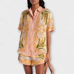 Omfavn retro elegans med vårt vintage botaniske kaleidoskoptrykk to-delt sett. Detta fantastiska sett består av en kraftfull skjorte med knappar, kombinert med en flytande, hög midje skört som visar livlig blomsterdesign och fascinerande symmetri, som utstrålar konstnärlig charm.