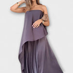 En elegant look utan ansträngning väntar på dig! Berika din sommargarderob med vår fantastiska off-shoulder topp och flödande maxikjol i två delar som ger din stil en extra dimension. Denna stiliga outfit har en modern off-shoulder design och asymmetrisk fåll, perfekt kombinerad med en lös maxikjol som rör sig graciöst med varje steg.