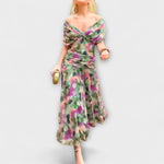 Kliva in i en värld av elegans med vår Maxikappa med V-ringning och fantasifullt blommönster . Denna fantastiska kappa har ett unikt blommönster som fångar essensen av hantverksskicklighet och charm, vilket gör den till det perfekta valet för speciella tillfällen.
