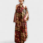 Denna fantastiska maxikappa med omvandlingsbara elegans kombinerade djärv med mångsidighet. Den har en stilren halter halsringning och unika tribalistiska detaljer och förändras enkelt från dag till natt.