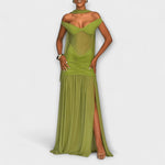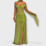 Tillverkad av lyxigt, elastiskt Slinky-material i en rik olivgrön nyans , är den helt fodrad för komfort och stil. Den låga V-ringningen på ryggen ger en touch av sensualitet, medan rynkningen och den höga slitsen vackert framhäver din figur.