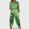 Detta tvådelade set i andningsbart, mjukt tyg erbjuder en elegant och mångsidig outfit som passar både för dagen och kvällen. Den halva blusen ger en touch av raffinerad elegans, medan de lösa byxorna säkerställer maximal komfort och rörelsefrihet.