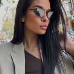 Upptäck solglasögonen Raede, tillverkade av högglansig koppar för den perfekta kombinationen av stil och funktionalitet. Dessa cat-eye solglasögon har en slank och sofistikerad design, perfekt för vardagsbruk.