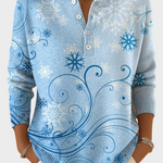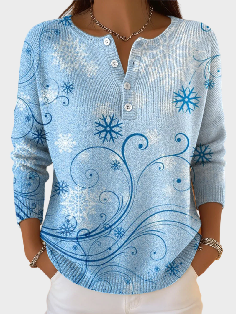 Den Elena jultröjan är tillverkad av en mjuk bomullsblandning och pryds av ett elegant tryck av snöflingor och slingrande vinterlinjer. Knapplåsningen vid halsen ger en klassisk finish som passar bra med den lugna, festliga designen.