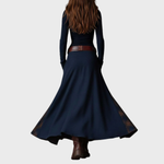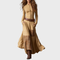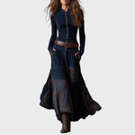 Denna unika maxiklänning förenar charmen av vintage stil med lättheten av modern elegans. Det mjuka materialet med mockaeffekt omsluter figuren fint, medan den åtsittande överdelen med ståkrage och metallknappar skapar ett distinkt, feminint utseende. Den utsvängda kjolen med panel i brun-blå rutigt ger helheten karaktär och en subtil konstnärlig touch.