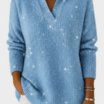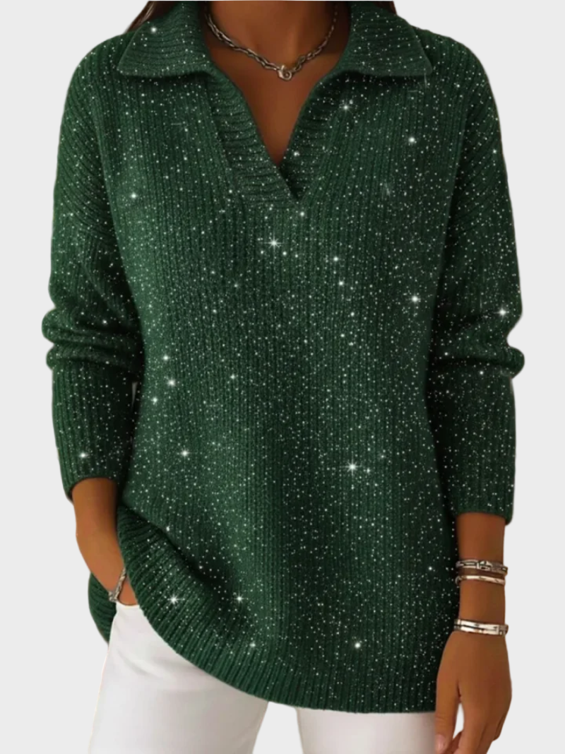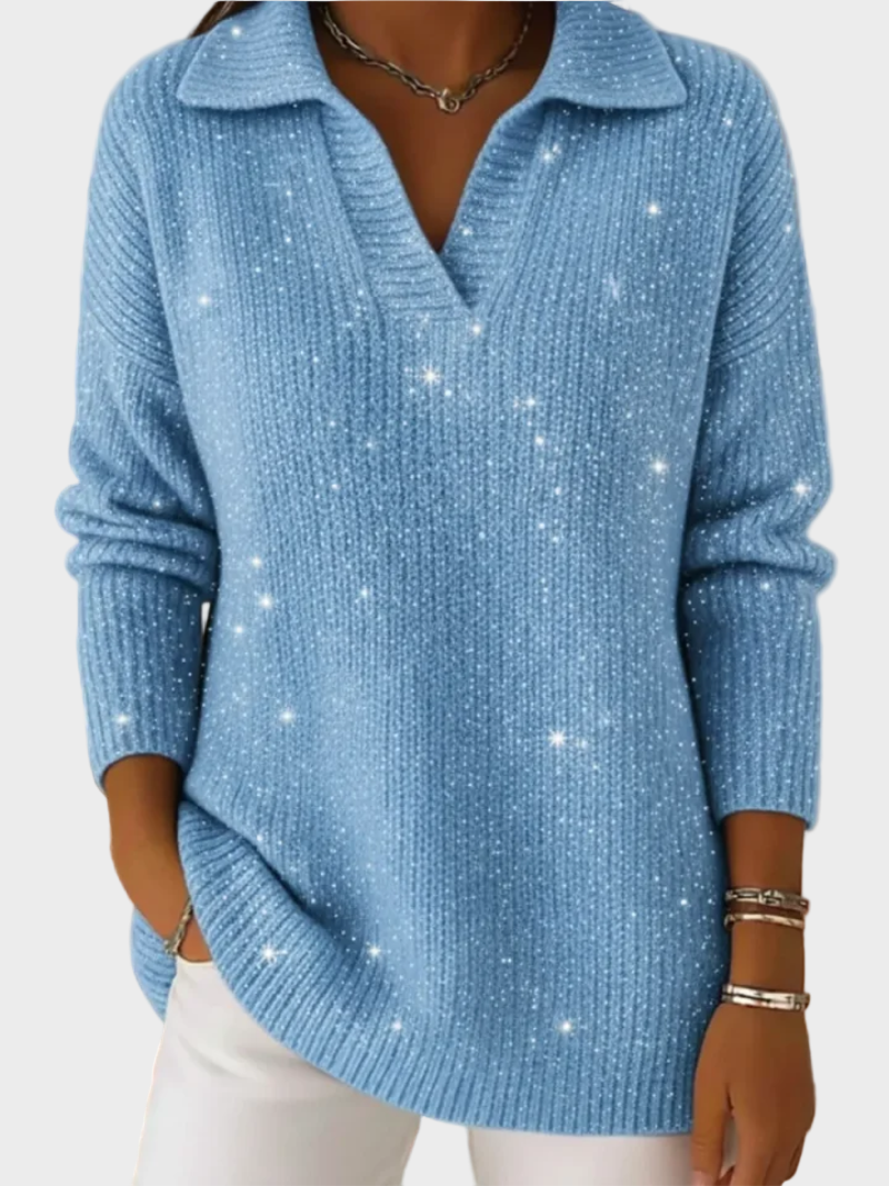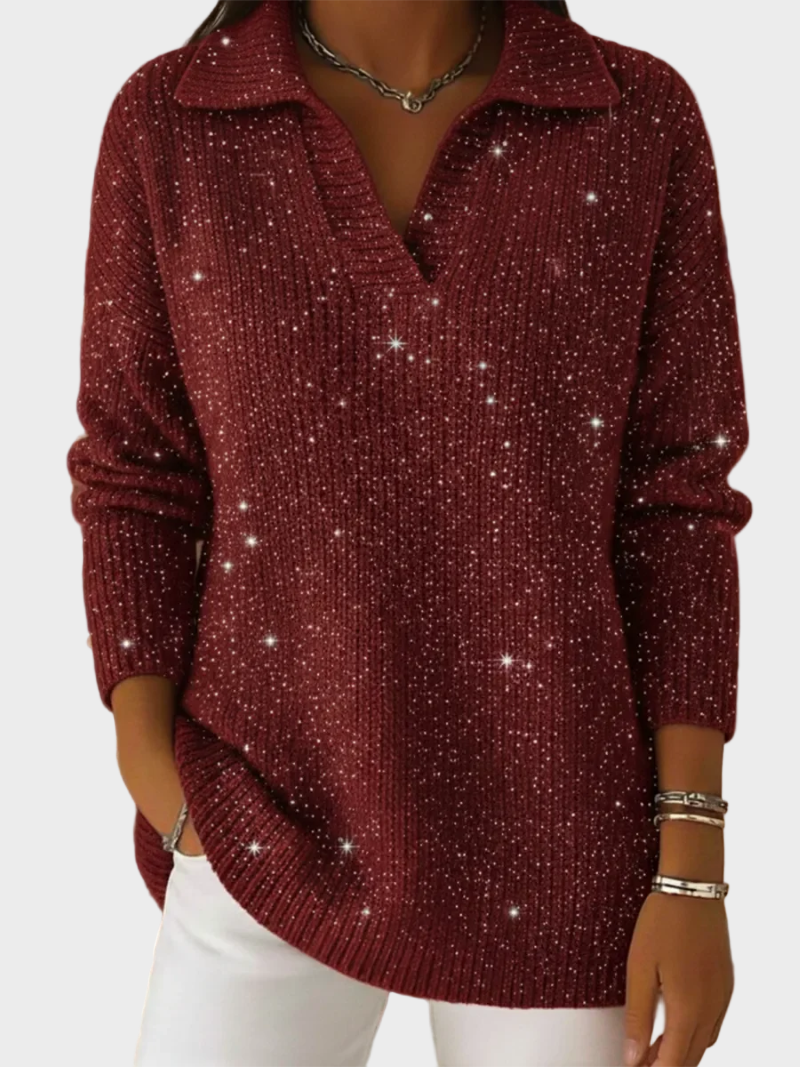 Jultröjan Livia är tillverkad av en mjuk bomullsblandning och har en fint stickad struktur med små glittrande detaljer. Kragen med V-hals ger ett elegant utseende som passar bra med den lugna, festliga designen.