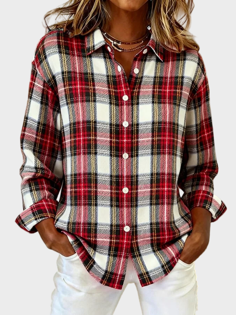 Blusen Mira kombinerar röd, vit och subtila mörka accenter i ett tidlöst rutmönster. Färgerna ger ett kraftfullt, fräscht utseende som är både avslappnat och prydligt. Tack vare den klassiska kragen och knappstängningen förblir silhuetten bekant och mångsidig.