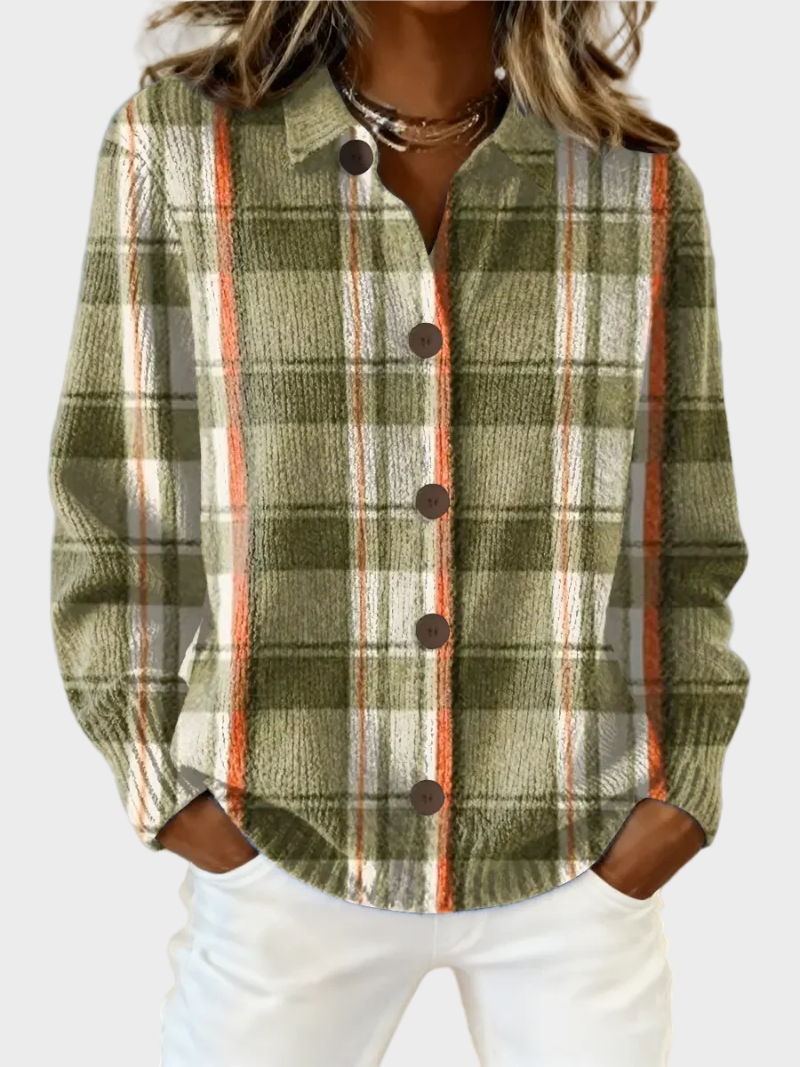 Blusen Noor har en mossa grön bas med subtila beige nyanser och ett iögonfallande rand i varm orange. Rutmönstret ser lugnt ut men är ändå uttalat tack vare de klara vertikala accenterna. Den klassiska kragen och knäppningen ger helheten en bekant och mångsidig karaktär.