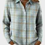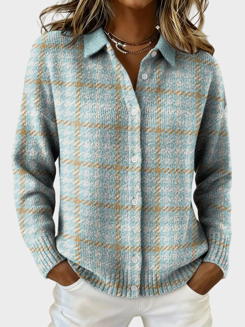 Blusen Tara har en frisk blandning av ljusblått och sandfärg, utförd i ett stort rutmönster med subtila fiskbensdetaljer. Kombinationen av nyanser ger ett klart, lugnt utseende som enkelt passar in i många outfits. De vita knapparna och den klassiska kragen ger en prydlig, tidlös finish.
